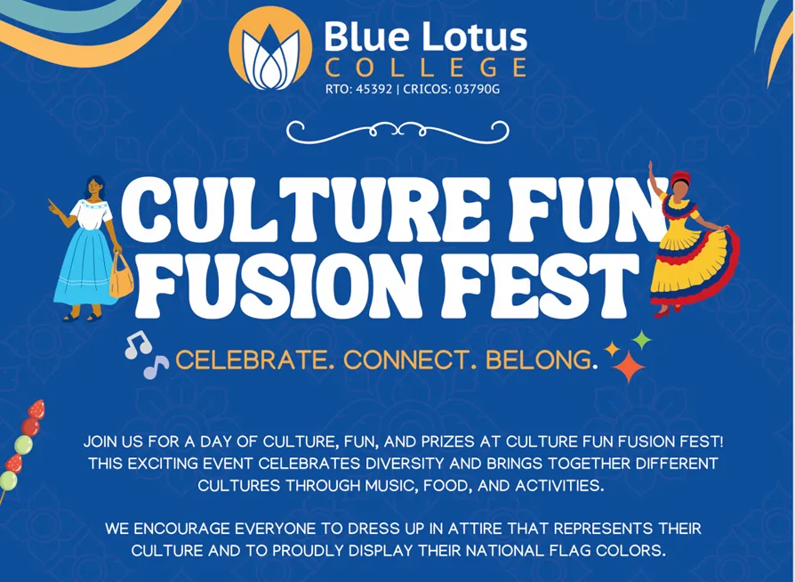 Join us for the Culture Fun Fusion Fest on Tuesday, 13 August at our 158 Swanston Street campus—a vibrant celebration of cultural diversity and community spirit! Experience an exciting day filled with live performances, international food stalls, and interactive cultural activities. Don’t miss the Best Dressed Contest (1 male and 1 female) where you can showcase your traditional or creative attire for a chance to win! There will also be lucky draws, fun games, and plenty of prizes up for grabs. Come celebrate, connect, and enjoy the fusion of cultures in a festive and welcoming atmosphere!